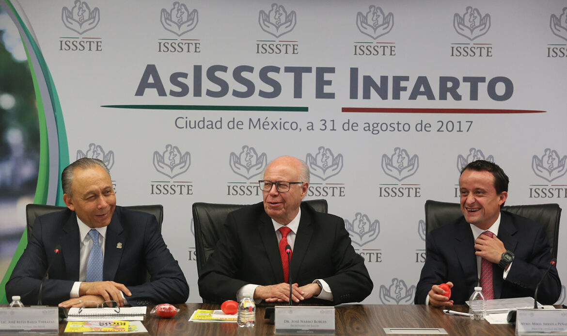 Flanqueado por el Secretario de Salud y el titular del IMSS, José Narro Robles y Mikel Arriola Peñalosa, respectivamente, el Director General del ISSSTE, José Reyes Baeza Terrazas, puso en marcha el programa AsISSSTE Infarto en nueve hospitales regionales y generales de la Ciudad de México y el área metropolitana, cuyo objetivo es proporcionar al paciente infartado atención rápida y terapia trombolítica en los primeros 30 minutos de su ingreso hospitalario y a quien lo amerite, tratamiento de hemodinamia en 60 o 90 minutos; acciones enfocadas a salvar vidas y limitar daño cardiaco.