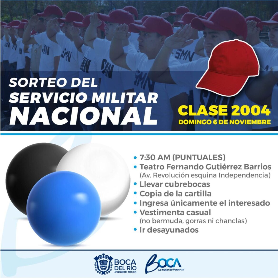 Por ello, el llamado a todos los conscriptos clase 2004 y remisos a que acudan al Sorteo del Servicio Militar Nacional, mismo que se realizará en el Teatro Fernando Gutiérrez Barrios de la cabecera municipal, este 6 de Noviembre, en punto de las 7:30 de la mañana.