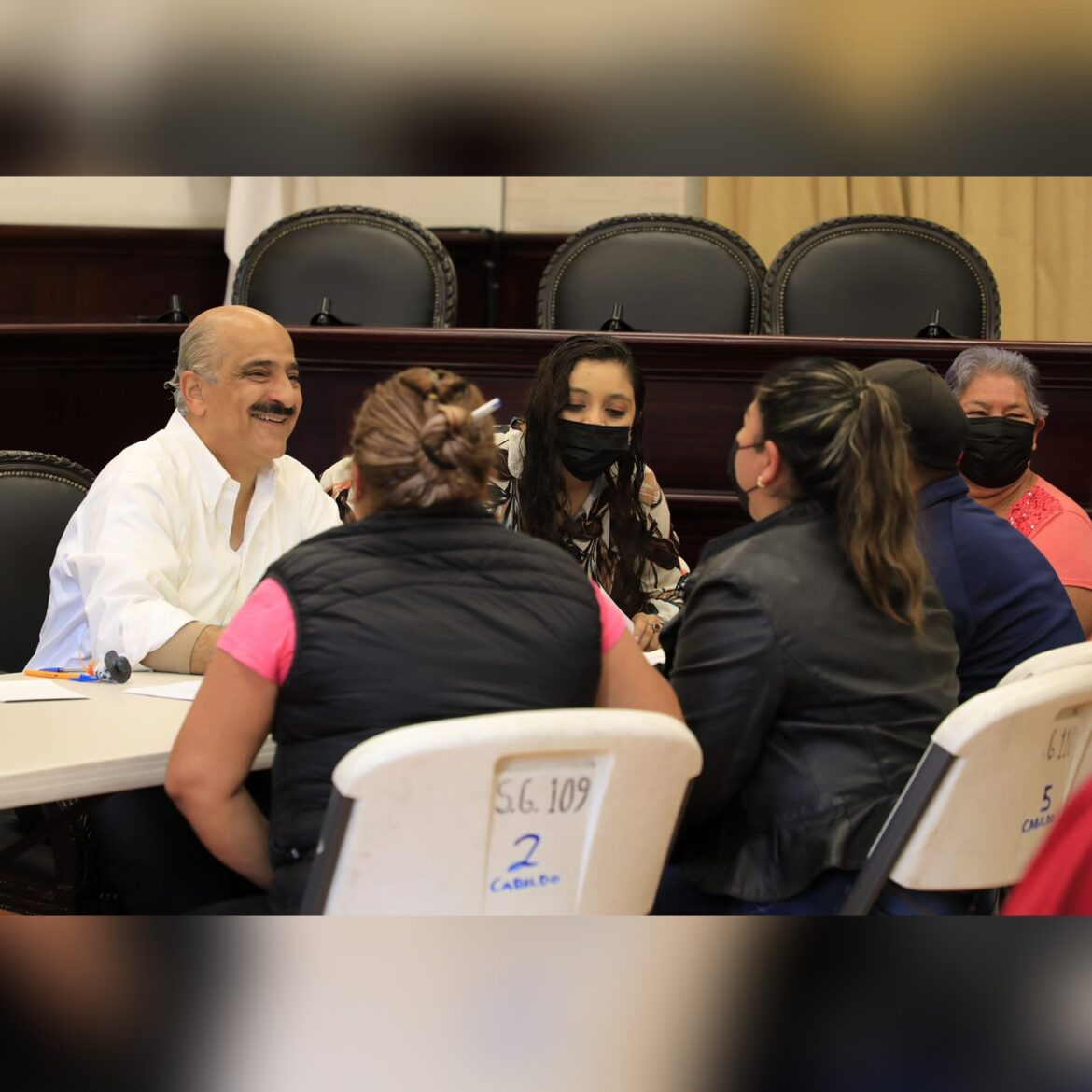 En la Sala de Cabildo, acompañado por los regidores Antonio Ballesteros Grayeb y Daniel Fernández Carrión; el director de Participación Ciudadana, Juan Marín Viveros, y el subdirector de Planeación y Proyectos, Gerardo Lobato Guzmán; el Edil canalizó las solicitudes a las áreas correspondientes.