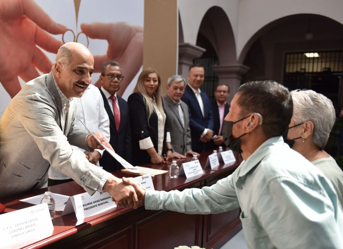 Xalapa, Ver.- Con la entrega simbólica de 44 actas de matrimonio, este día formalizaron su relación más de 300 parejas a través del programa de Bodas Colectivas, impulsado por la Dirección General del Registro Civil y el Ayuntamiento de Xalapa.