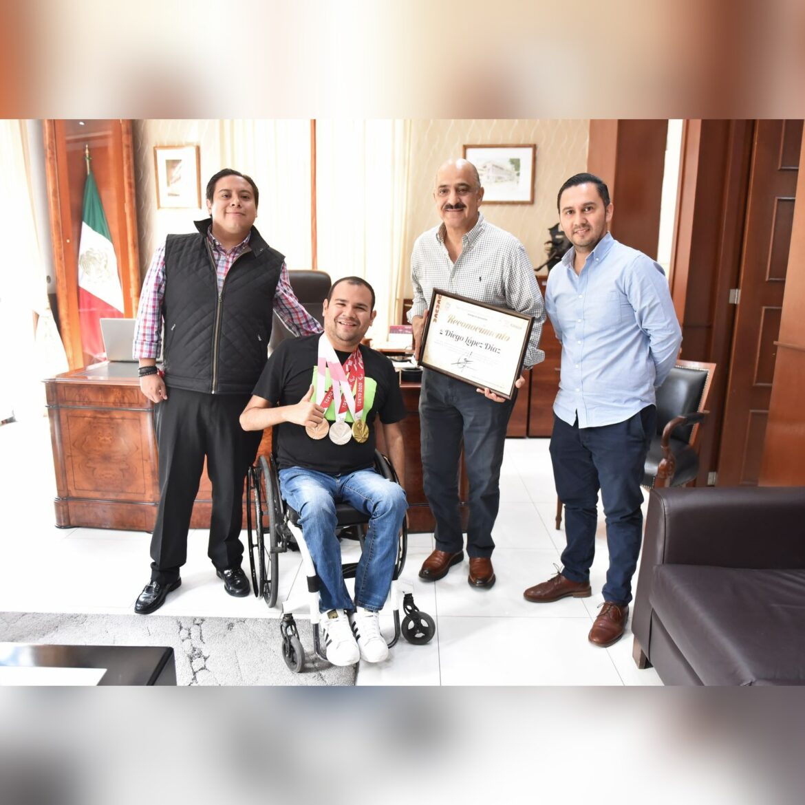 Xalapa, Ver.- Por sus nueve años como campeón nacional de paranatación y su destacada trayectoria como atleta paralímpico, Diego López Díaz recibió un reconocimiento del presidente municipal Ricardo Ahued Bardahuil y el regidor Carlos Rugerio Martínez.