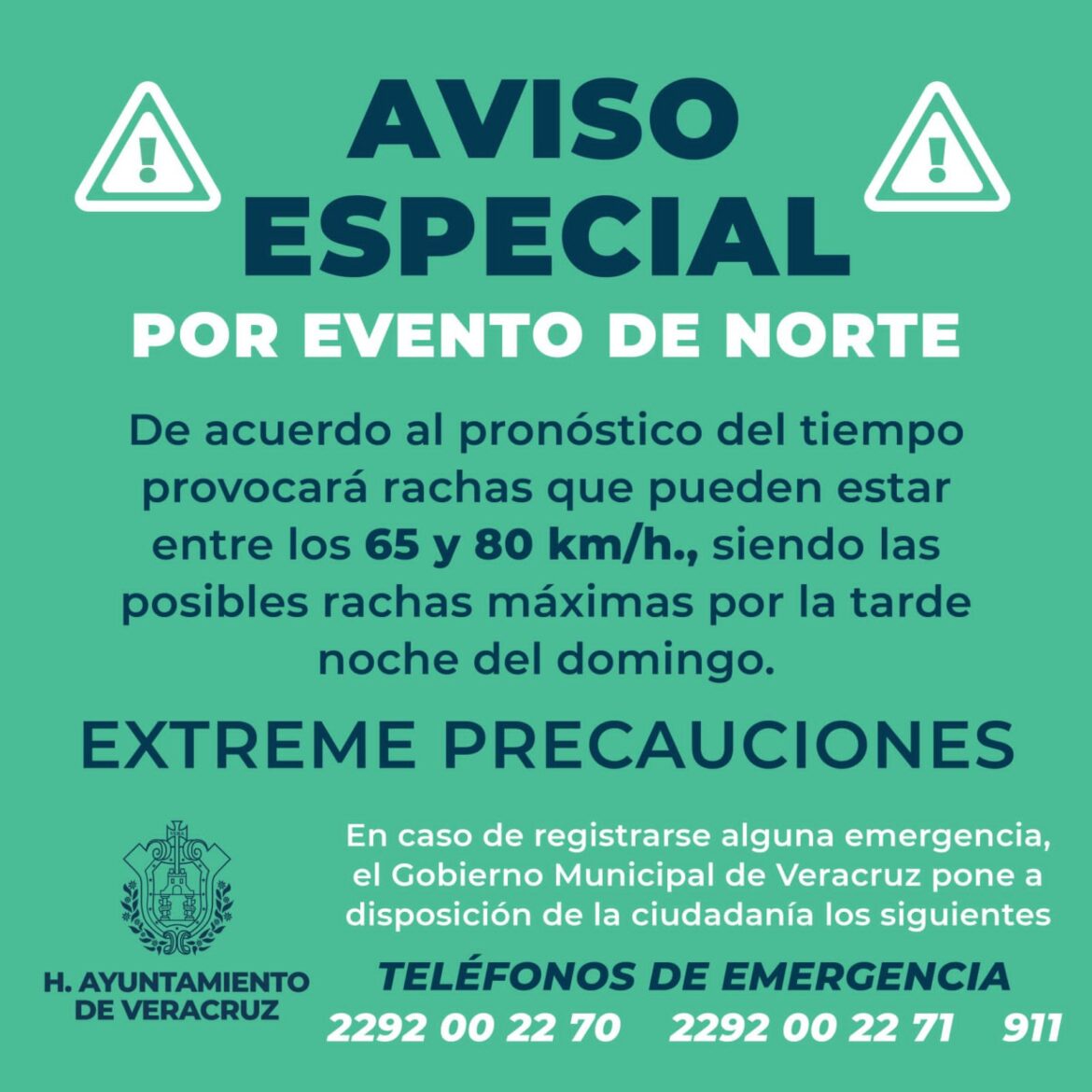 Veracruz, Ver., 14 de abril de 2023.- El Gobierno Municipal de Veracruz, a través de la Unidad de Protección Civil, emite un aviso especial por evento de norte para el domingo 16 de abril.