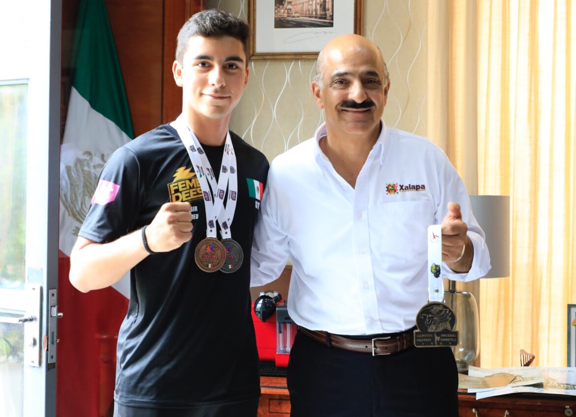 Xalapa, Ver.- Este viernes, el presidente municipal Ricardo Ahued Bardahuil recibió a Jabir Jamed Dorantes, taekwondista de 17 años, quien recientemente obtuvo las medallas de plata y bronce durante el Campeonato Mundial de Tae Kwon Do Escolar.