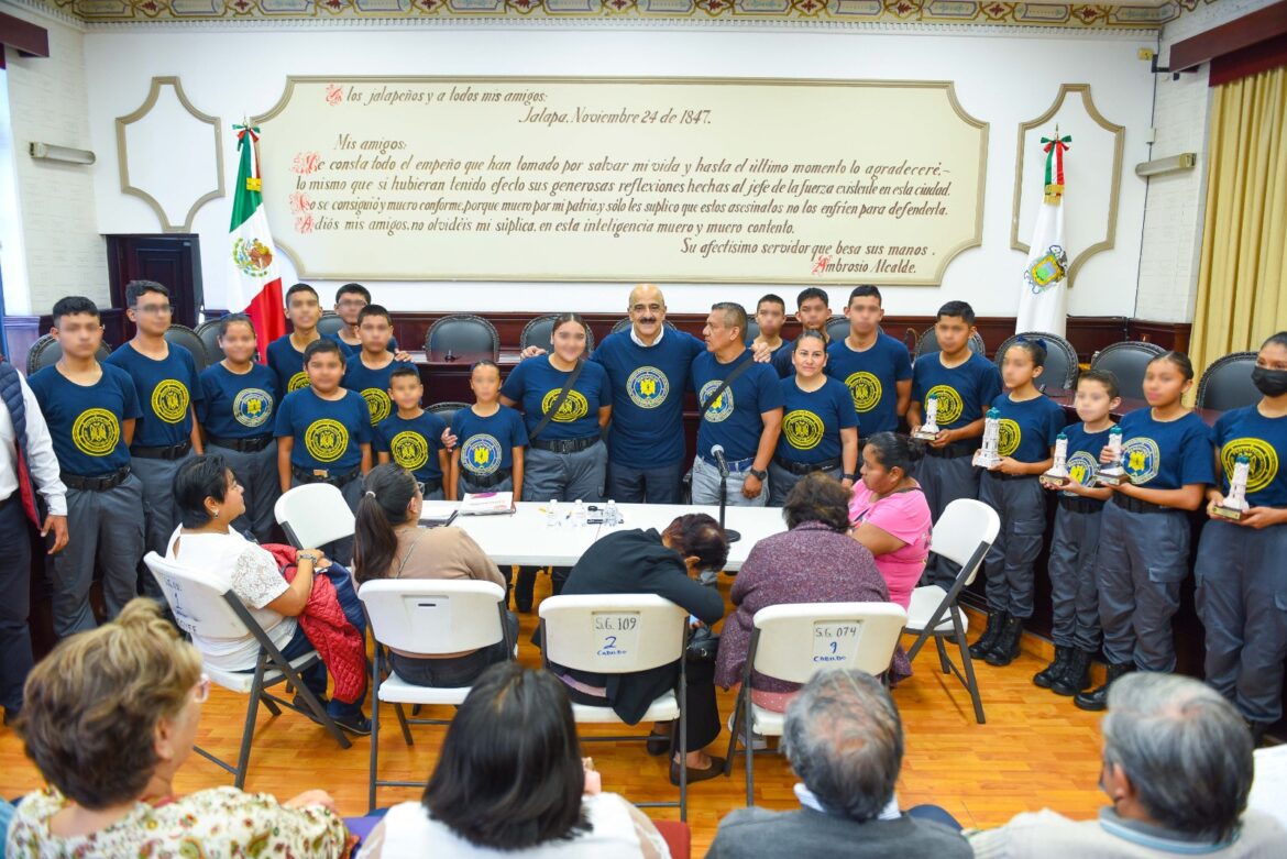 Xalapa, Ver.- El presidente municipal Ricardo Ahued Bardahuil recibió y reconoció esta mañana en la Sala de Cabildo a representantes xalapeños del Pentathlón Deportivo Militarizado Universitario, quienes obtuvieron el tercer lugar durante la pasada Convención Nacional desarrollada en la ciudad de Pachuca de Soto, Hidalgo.