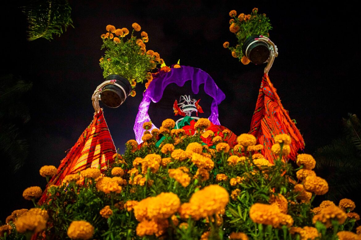 Xalapa, Ver.- Como parte de las actividades para conmemorar el Día de Muertos, esta noche trabajadores de la Dirección de Medio Ambiente colocaron una catrina con flores de cempasúchil en la zona del Teatro del Estado.