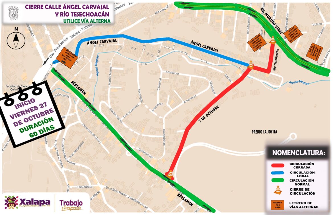 Xalapa, Ver.- Con el fin de concluir la rehabilitación integral de la calle 2 de Octubre, a partir de este viernes se cerrará a la circulación vehicular un tramo de la calle Ángel Carvajal y la calle Río Tesechoacán, en la Unidad del Valle.