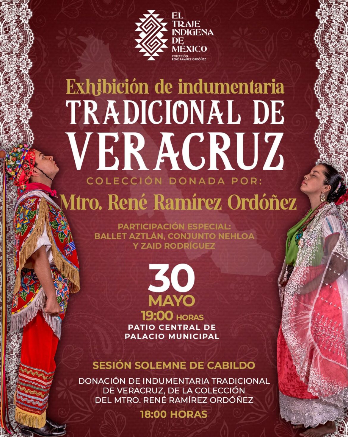 Xalapa, Ver.- El Palacio Municipal de Xalapa abrirá sus puertas a la exhibición “Indumentaria Tradicional de Veracruz”, una colección donada por el maestro René Ramírez Ordóñez que muestra los bordados y trajes que forman parte de la cultura de los pueblos originarios de nuestro estado.