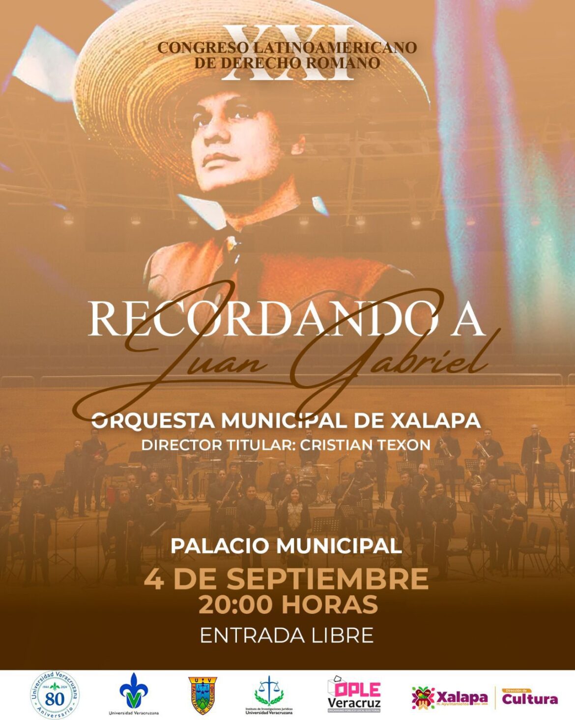 Este 4 de septiembre, a las 20:00 horas, la Orquesta Municipal de Xalapa (OMX) ofrecerá en Palacio Municipal el concierto “Recordando a Juan Gabriel”. Además, el próximo 12 de septiembre, a las 19:00 horas, acompañada de Doris, “La Reina del Bolero”, en este mismo espacio se llevará a cabo el concierto “Vivir cantando”.
