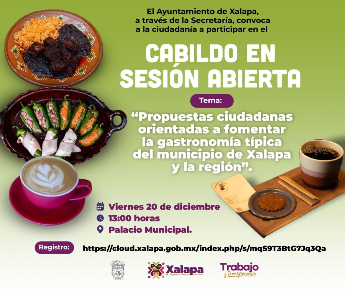 Xalapa, Ver.- Con el fin de recibir propuestas ciudadanas orientadas a fomentar la difusión y fortalecimiento de la gastronomía típica del municipio de Xalapa y la región, el próximo viernes 20 de diciembre, a las 13:00 horas, se desarrollará el sexto Cabildo en Sesión Abierta del año, por lo que se invita a la población a participar.