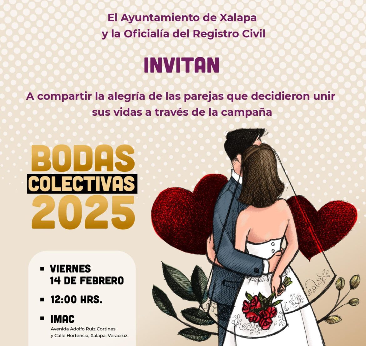 Xalapa, Ver.- Para celebrar el Día del Amor, brindar certeza jurídica y fortalecer el núcleo familiar, el Ayuntamiento y el Registro Civil de Xalapa llevarán a cabo este 14 de febrero a las 12:00 horas la ceremonia protocolaria de entrega de actas matrimoniales correspondientes a la campaña Bodas Colectivas 2025.