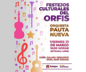 El viernes 21 de marzo, los Festejos Culturales del Orfis comenzarán a las 16:30 horas en la carretera Xalapa-Veracruz #1102, Rubí Ánimas, con la participación de la Orquesta Pauta Nueva.