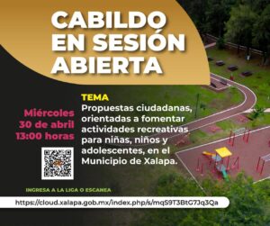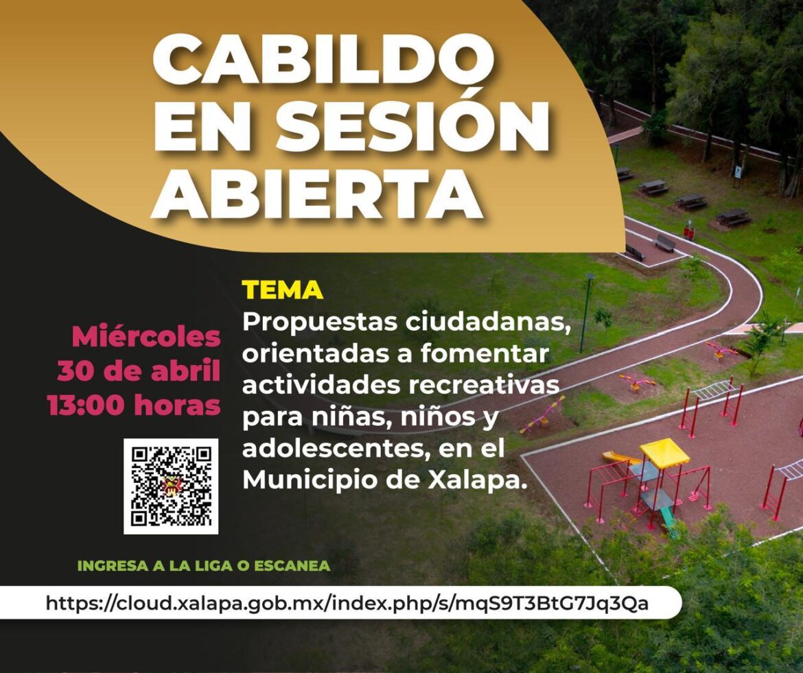 Xalapa, Ver.- El Ayuntamiento, a través de la Secretaría, convoca a la ciudadanía a participar en el segundo Cabildo en Sesión Abierta del año, el cual se llevará a cabo este 30 de abril a las 13:00 horas, con el fin de recibir propuestas orientadas a fomentar las actividades recreativas para niñas, niños y adolescentes.