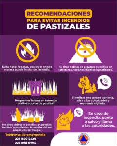 Además, recomendó evitar las quemas agrícolas no controladas, así como no hacer fogatas, tirar colillas de cigarro o cerillos encendidos en terrenos baldíos o pastizales.