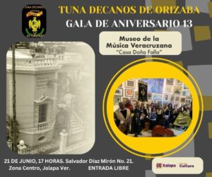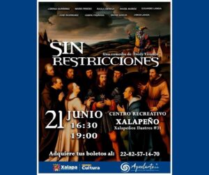 En el CRX se tendrá la obra de teatro “Sin restricciones”, una comedia de Fredy Vivanco. A las 17:00 horas, en Museo de la Música Veracruzana, se desarrollará el concierto de gala por el 13 aniversario de la Tuna Decanos de Orizaba.