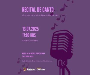 En el mismo recinto, se realizará el Recital de Verano con alumnos de Mumo: Estudio de Piano y Violín. A las 18:40 horas, en el Barrio Mágico de Xallitic, se llevará a cabo el fandango “Un legado veracruzano”.