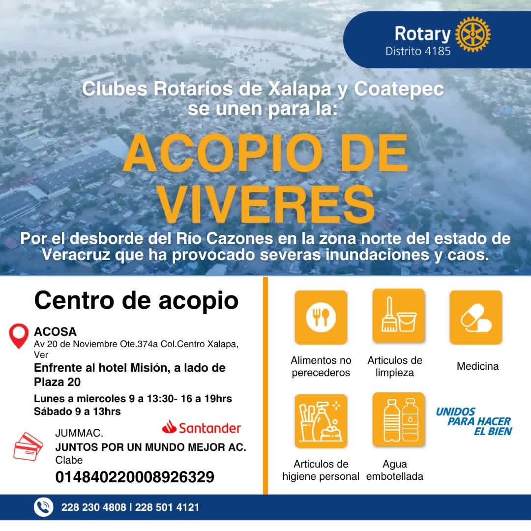 Los Clubes Rotarios de Xalapa siempre altruistas y serios, ubican un Centro de Acopio en Xalapa junto a la Casa del Pan en 20 de noviembre. Posteriormente enviarán fotografias de las entregas personales que realizarán en propia mano de los damnificados.