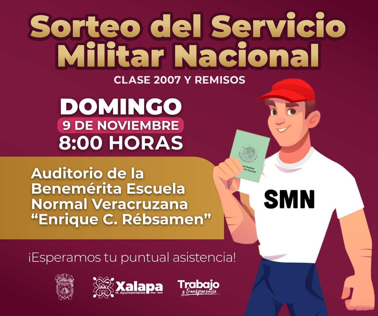 Xalapa, Ver.- El domingo 9 de noviembre, a las 8:00 horas, se llevará a cabo el Sorteo del Servicio Militar Nacional para Jóvenes de la Clase 2007 y Personal Remiso, por lo que se recuerda a quienes participaron en la Fase de Alistamiento, que deben presentarse a este evento, que se realizará en el auditorio de la Benemérita Escuela Normal Veracruzana “Enrique C. Rébsamen”.