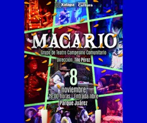 El grupo de Teatro Campesino Comunitario presentará la obra “Macario”, en el Parque Juárez, a las 19:00 horas; a esta misma hora, en el auditorio de la IMAC, se proyectará la película “Metrópolis”, musicalizada por el pianista Luca Rebola.